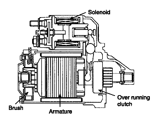 The contacts close and the starter motor cranks. In order to prevent damage caused by excessive rotation of the starter armature when the engine starts, the clutch pinion gear overruns.