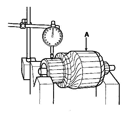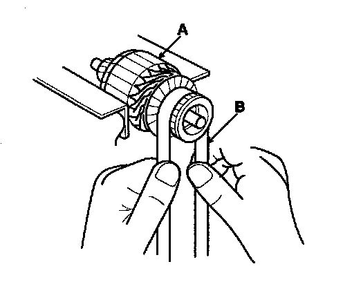 4. Check the commutator (A) surface. If the surface is dirty or burnt, resurface with emery cloth or a lathe within the following specifications, or recondition with #500 or #600 sandpaper (B).