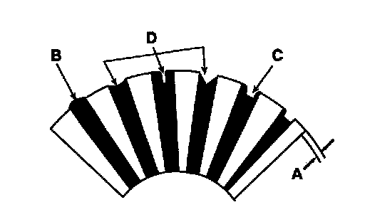 7. Check the mica depth (A). If the mica is too high (B), undercut the mica with a hacksaw blade to the proper depth. Cut away all the mica (C) between the commutator segments. The undercut should not be too shallow, too narrow, or v-shaped (D).