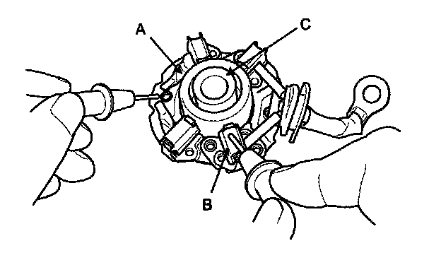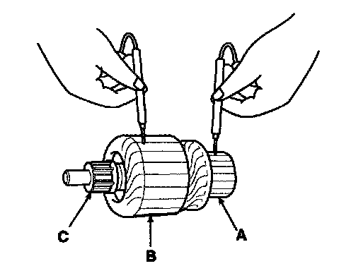 9. Check with an ohmmeter that no continuity exists between the commutator (A) and armature coil core (B), and between the commutator and armature shaft (C). If continuity exists, replace the armature.