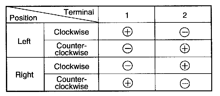 3. Connect the motor terminals directly to battery voltage (12 V) and check that the motor operates smoothly. Next, reverse the polarity and check that the motor operates smoothly in the reverse direction. If the operation is abnormal, replace the motor.