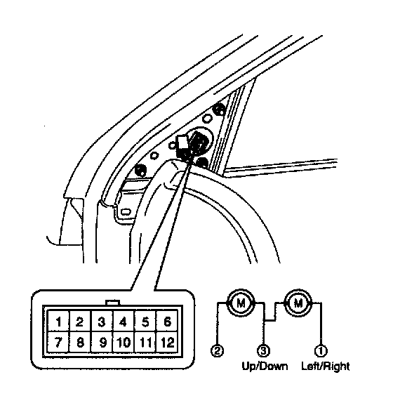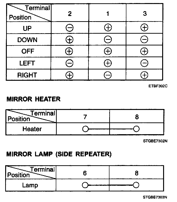 3. Apply battery voltage to each terminal as shown in the table and verify that the mirror operates properly.