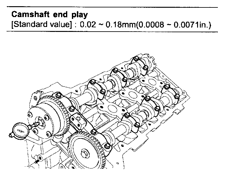 2) Using a dial indicator, measure the end play while moving the camshaft back and forth.