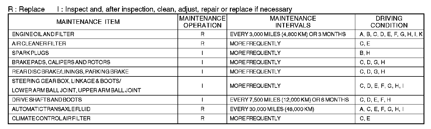 The following items must be serviced more frequently on cars normally used under severe driving conditions. Refer to the chart below for the appropriate maintenance intervals.
