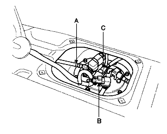 2. Disconnect the Fuel Feed Quick-Connector (A), Fuel Tank Pressure Sensor Connector (B) and Fuel Pump & Sub Fuel Sender Connector (C).