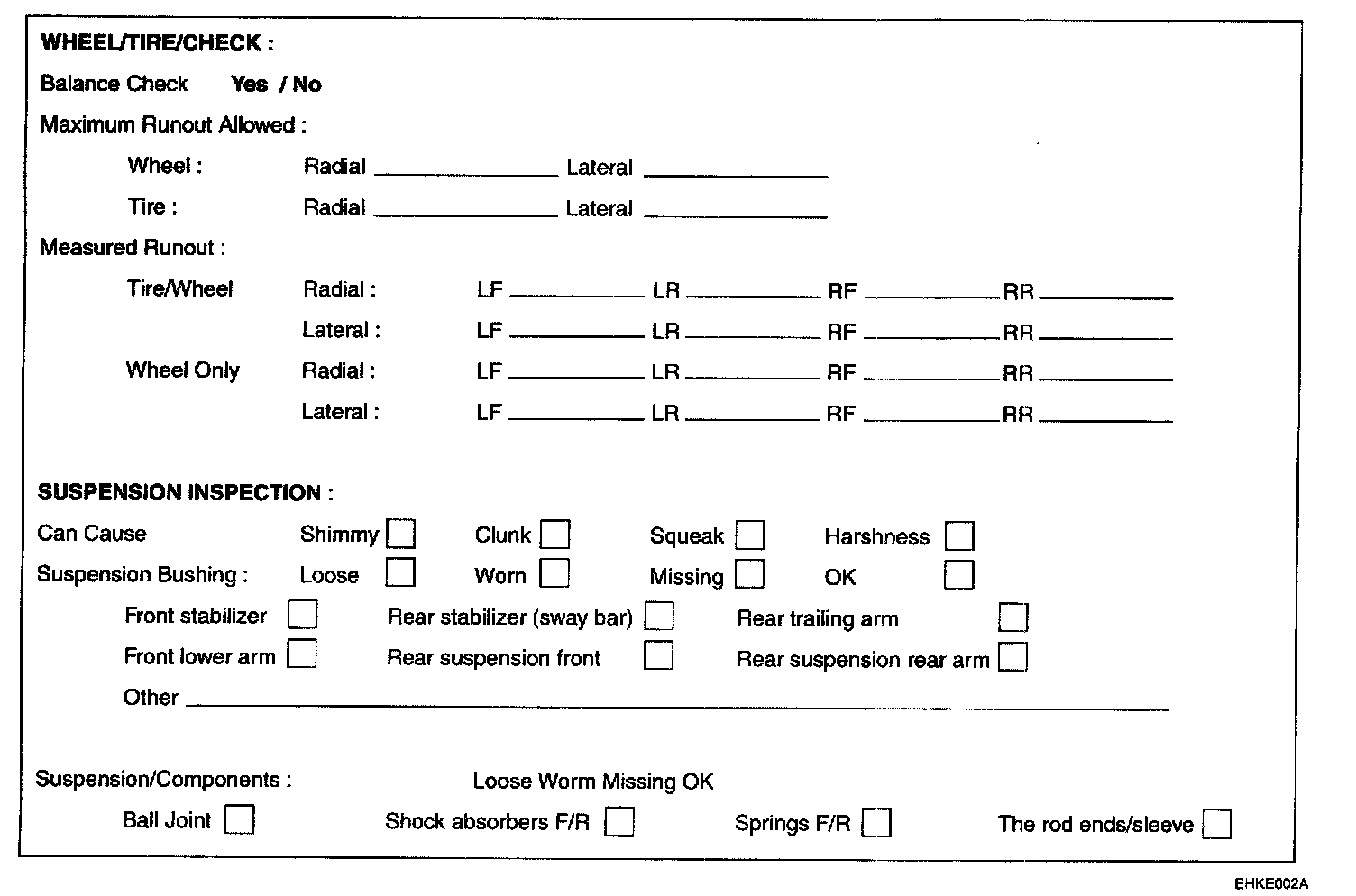 VEHICLE INSPECTIONTo assist the service advisor and the technician, check the suspension and wheel/tire condition with the questions listed below by filling them. It serves as a place to record information as well as data from the testing to be carried out. To begin a successful diagnosis, complete the questions.