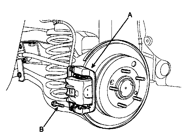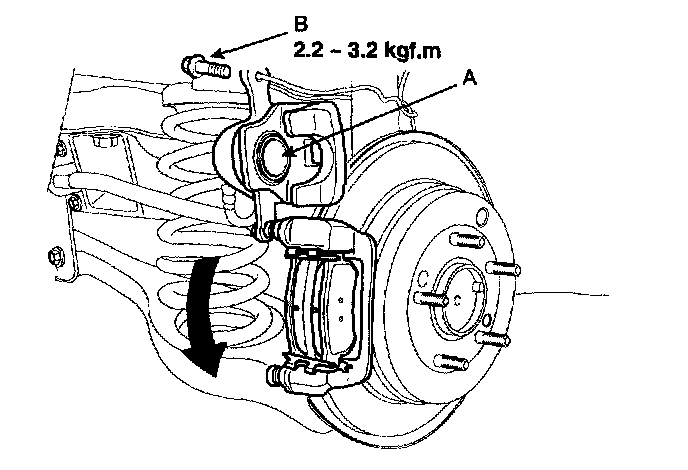6. Pivot caliper down into position. Being careful not to damage the pin boot, install the guide rod bolt (B) and torque it to proper specification