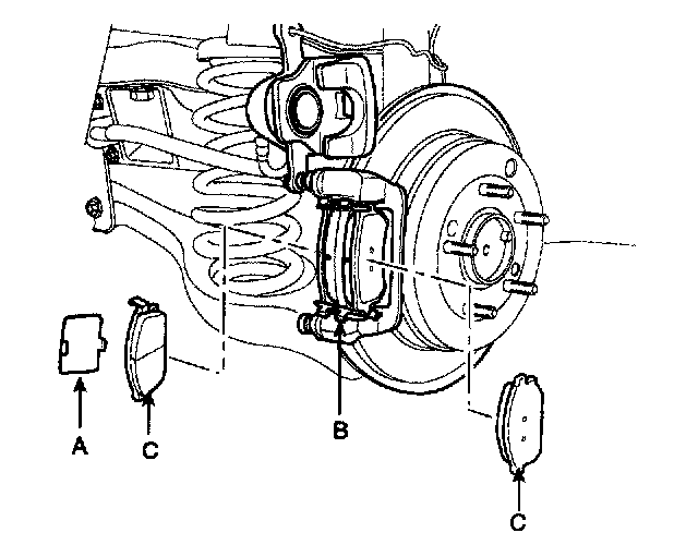 4. Install the brake pads (B) and pad shims (A) correctly. Install the pad with the wear indicator (C) on the inside.