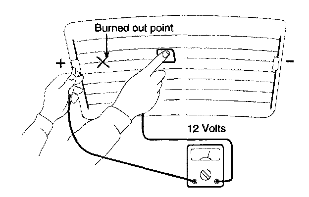 5. Use an ohmmeter to measure the resistance of each heater line between a terminal and the center of a grid line, and between the same terminal and the center of one adjacent heater line. The section with a broken heater line will have a resistance twice as that in other sections. In the affected section, move the test lead to a position where the resistance sharply changes.