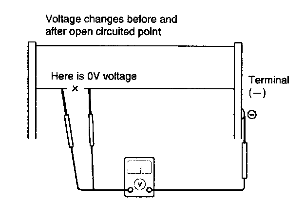 4. To check for open circuits, slowly move the test lead in the direction that the open circuit seems to exist. Try to find a point where a voltage is generated or changes to 0 V. The point where the voltage has changed is the open-circuit point.