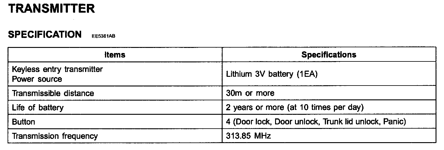 Keyless Entry Transmitter: Specifications
