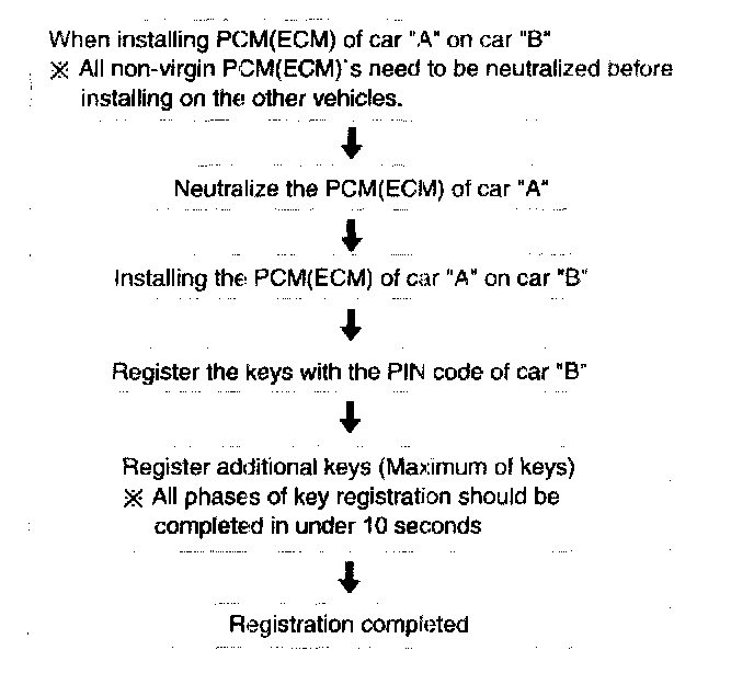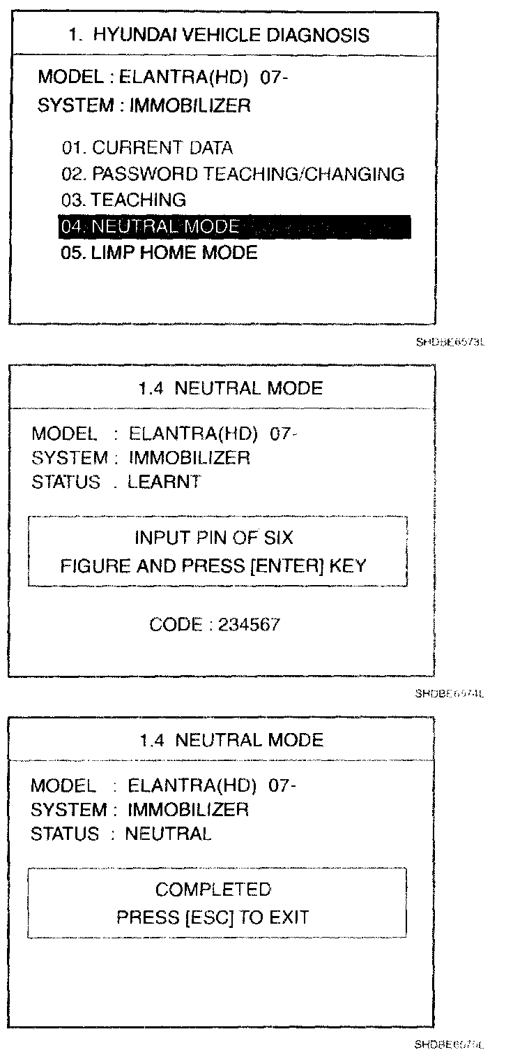 (Refer to the Things to do when Key & PIN Code the PCM(ECM) can be set to the "neutral" status by a scanner. A valid ignition key is inserted and after ignition on is recorded, the PCM(ECM) requests the vehicle specific data from the scanner. The communication messages are described at" Neutral Mode". After successfully receiving the data, the PCM(ECM) is neutralized.
