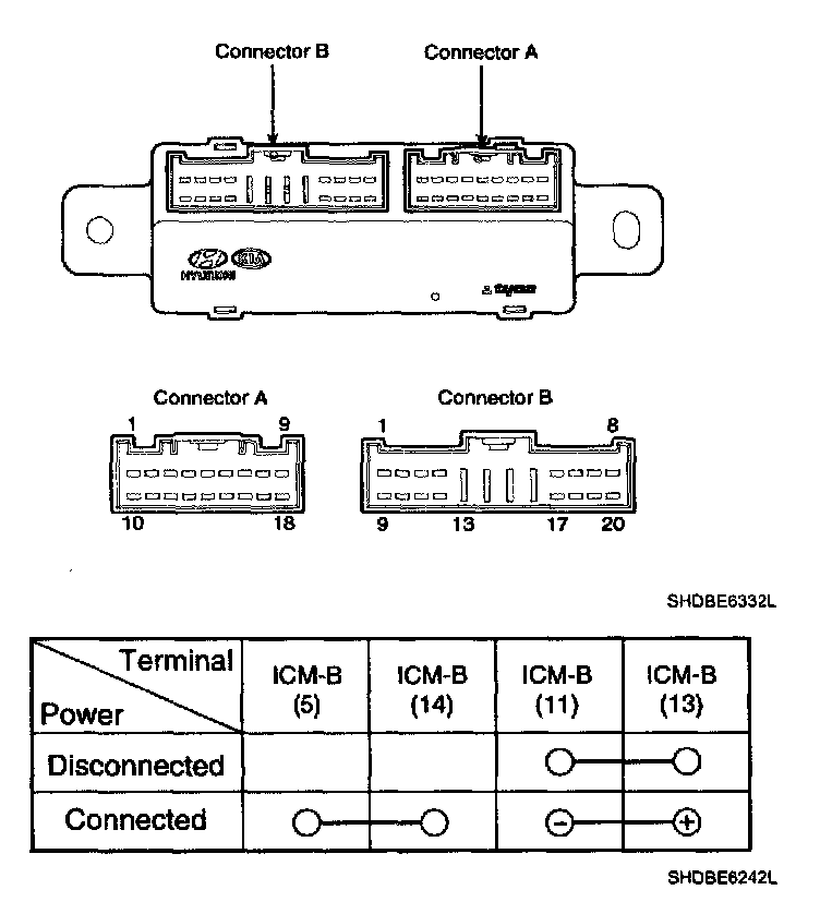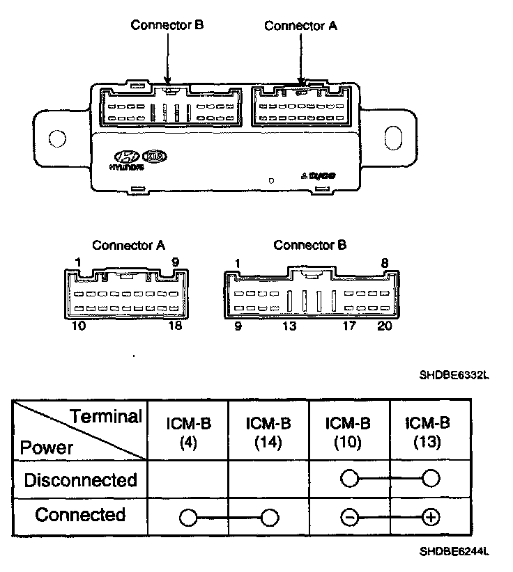 4. There should be continuity between the No.4 terminal and No.14 terminal in the ICM-B when power and ground are connected to the No.10 terminal and No.13 terminal in the ICM-B.