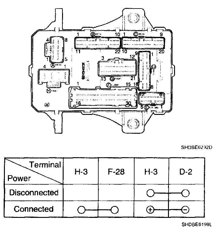 4. There should be continuity between the No.3 terminal in the I/P-H and the No.2 terminal in the I/P-D when power and ground are connected to the No.3 terminal in the I/P-H and the No.28 terminal in the I/P-F.