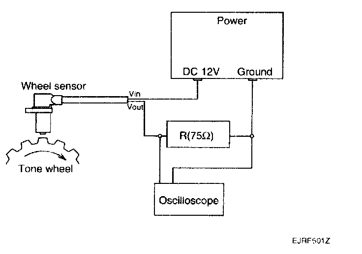 CAUTION: In order to protect the wheel speed sensor, when measuring output voltage, a 75 Ohms resistor must be used as shown.