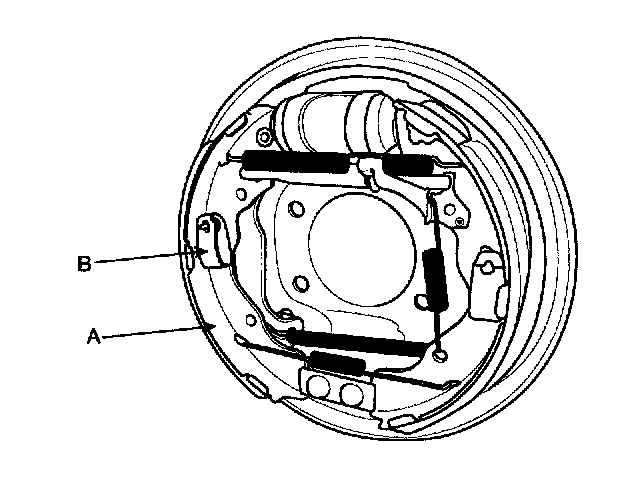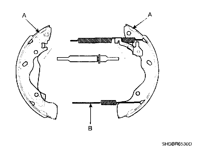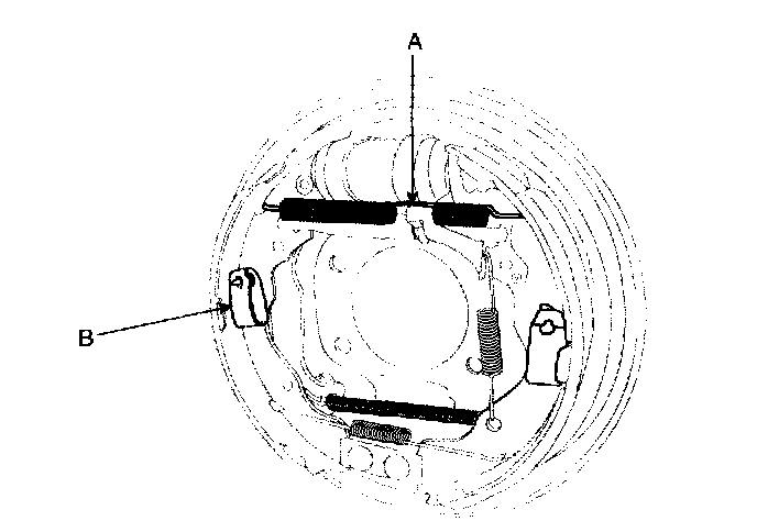 6. Lower the brake shoe assembly (A), and remove the lower return spring (B). Make sure not to damage the dust cover on the wheel cylinder.