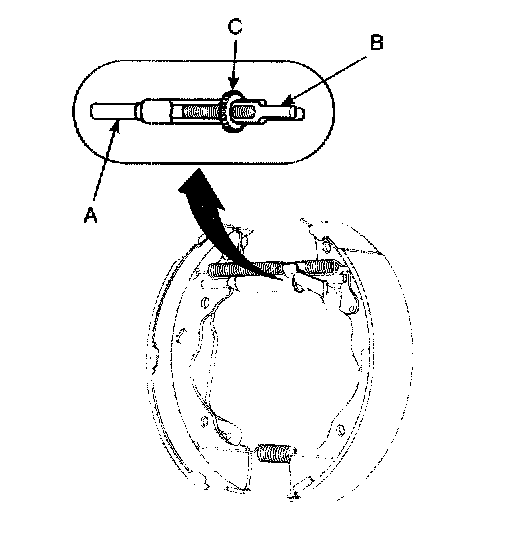 6. Install the adjuster assembly (B) and upper return spring (C) as right direction. Be careful not to damage the wheel cylinder dust covers.