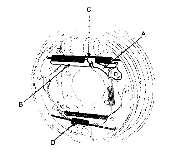 10. Remove the bolt (C) and the wheel cylinder (B) from the backing plate (D).