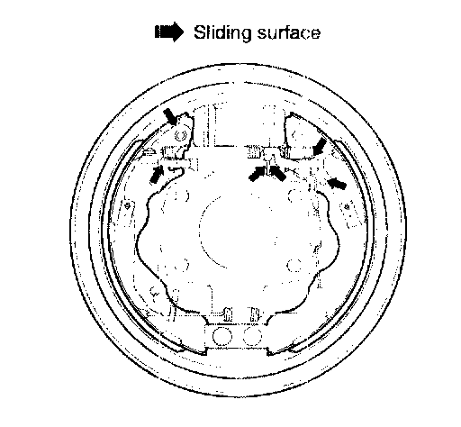8. Apply brake cylinder grease or equivalent rubber grease to the sliding surfaces shown. Don't get grease on the brake linings.