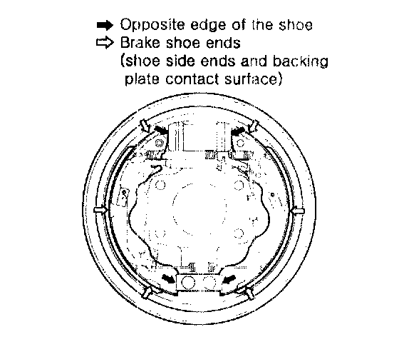 9. Apply brake cylinder grease or equivalent rubber grease to the brake shoe ends and opposite edges of the shoes shown. Don't get grease on the brake linings.