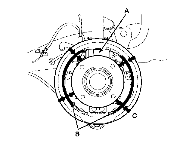 1. Apply sealant (C) between the wheel cylinder (A) and backing plate (B), and install the wheel cylinder.