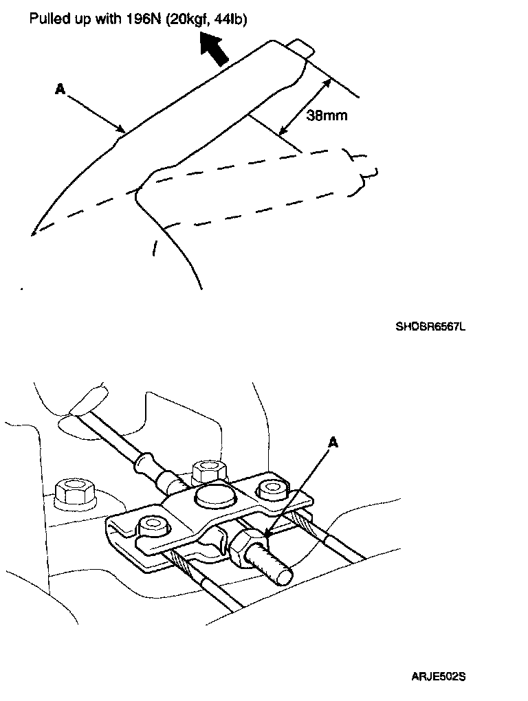 3. Adjust the parking brake lever stroke by turning adjusting nut (A).