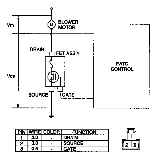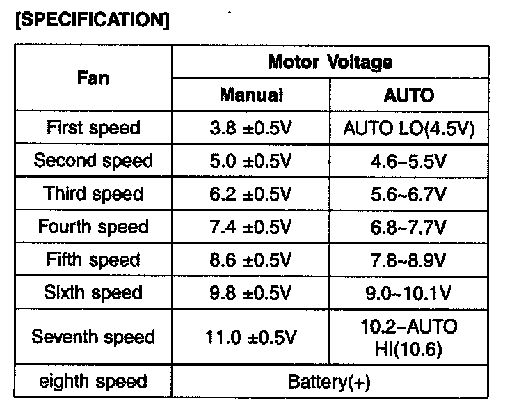 2. Manually operate the control switch and measure the voltage of blower motor between pin 1 and 2.