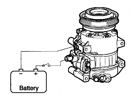 4. Check operation of the magnetic clutch.Connect the compressor side terminals to the battery (+) terminal and the ground battery (-) terminal to the compressor body.