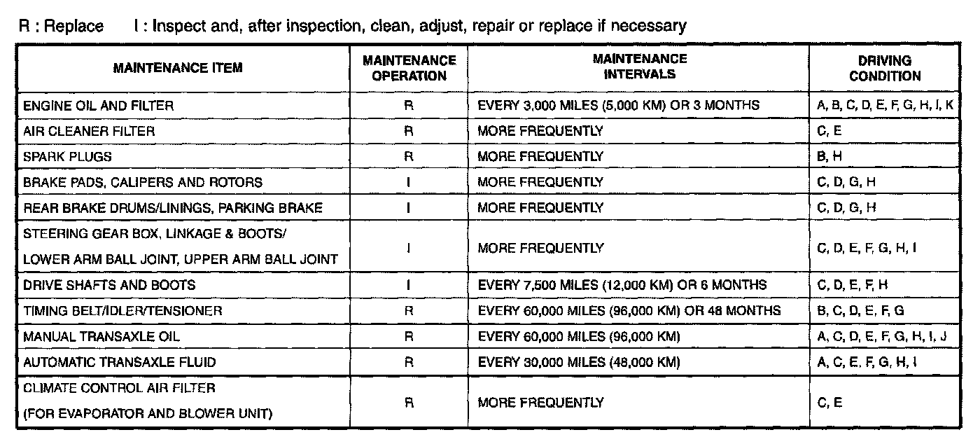 The following items must be serviced more frequently on cars normally used under severe driving conditions. Refer to the chart below for the appropriate maintenance intervals.