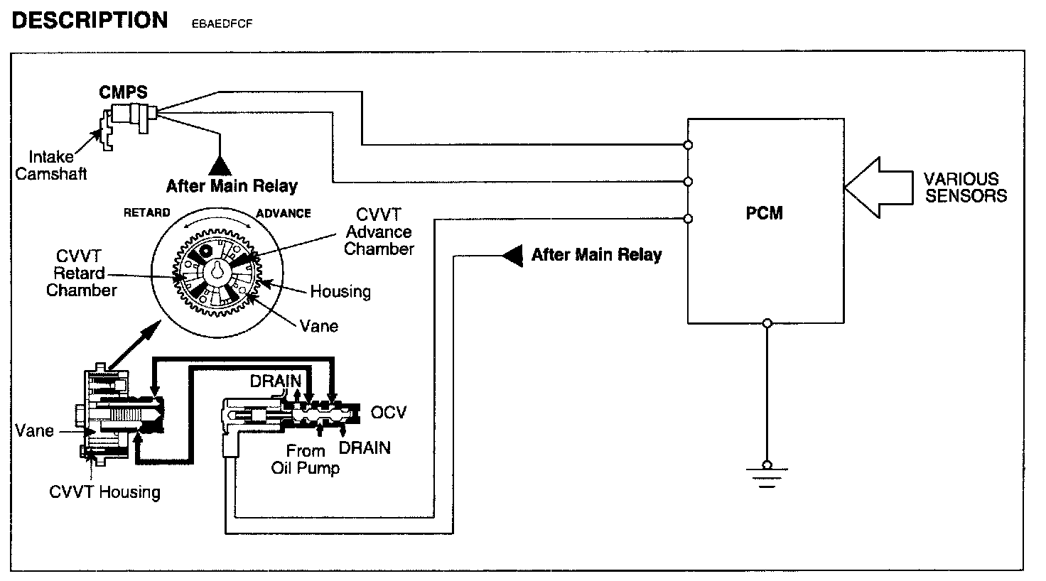 The CVVT changes the phase of the intake camshaft via oil pressure.