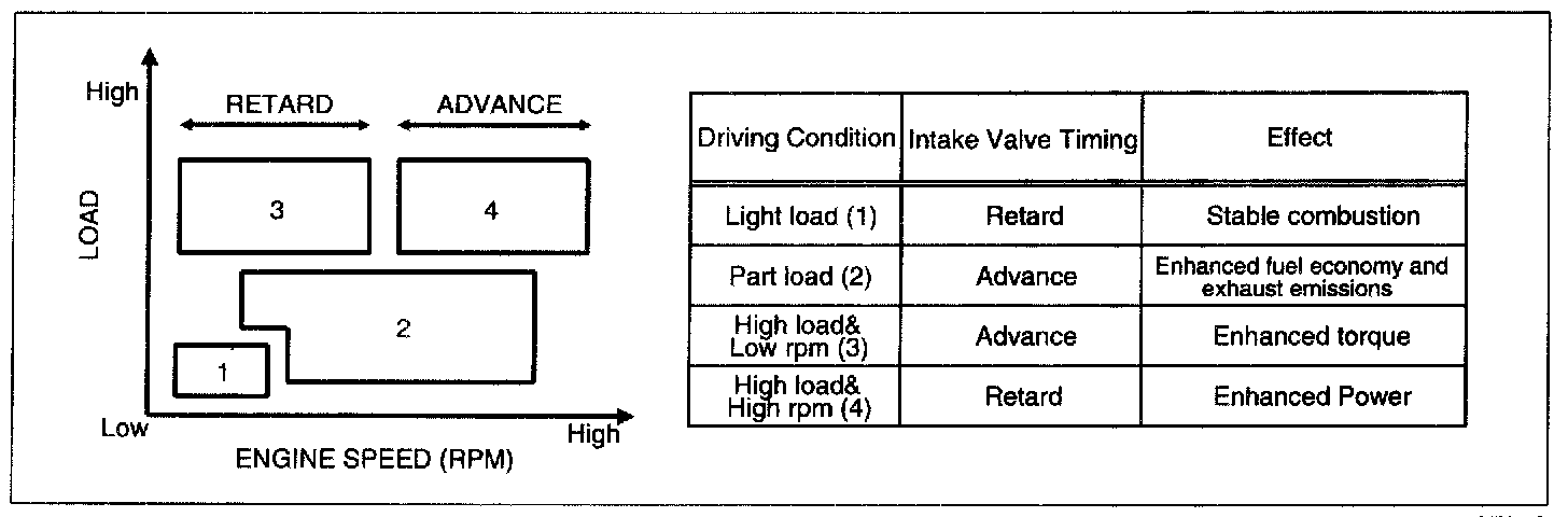 This CVVT system improves fuel efficiency and reduces NOx emissions at all levels of engine speed, vehicle speed, and engine load by EGR effect because of valve overlap optimization.
