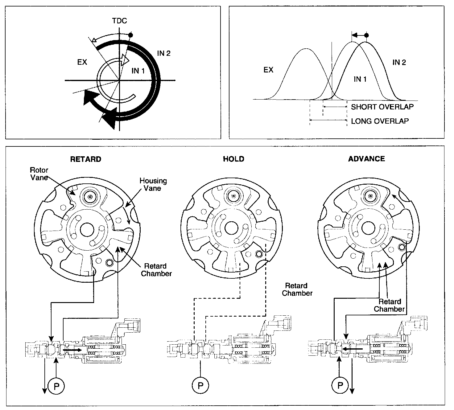 Cam angle is advanced to obtain the EGR effect and reduce pumping loss. The intake valve is closed quickly to reduce the entry of the air/fuel mixture into the intake port and improve the changing effect. Reduces the cam advance at idle, stabilizes combustion, and reduces engine speed.
