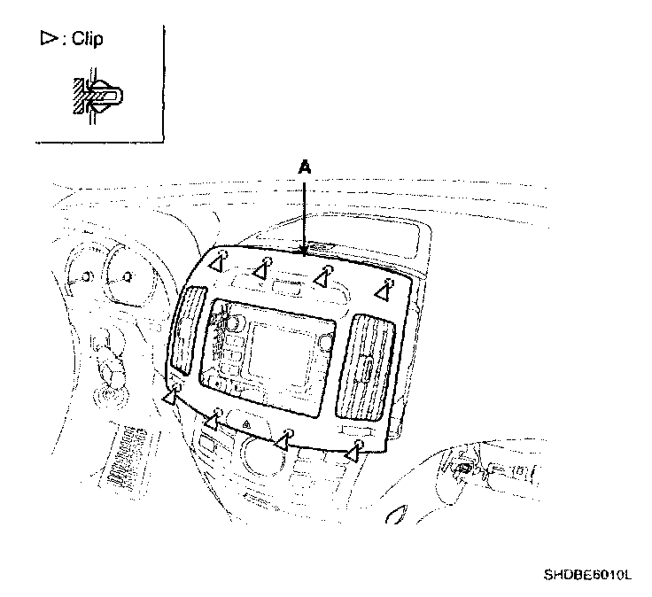 Remove the center facia panel(A). Take care not to damage fixing clips.