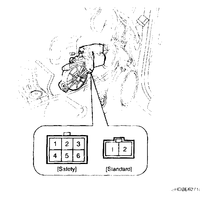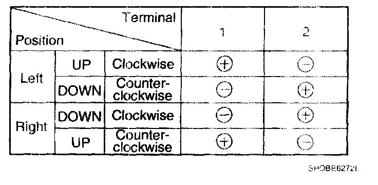 4. Connect the motor terminals directly to battery voltage (12 V) and check that the motor operates smoothly. Next, reverse the polarity and check that the motor operates smoothly in the reverse direction If the operation is abnormal replace the motor.