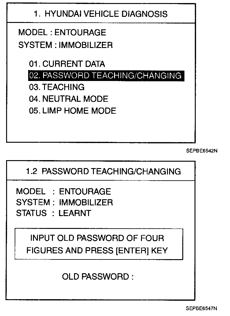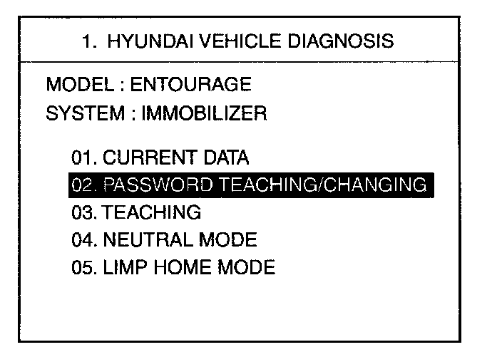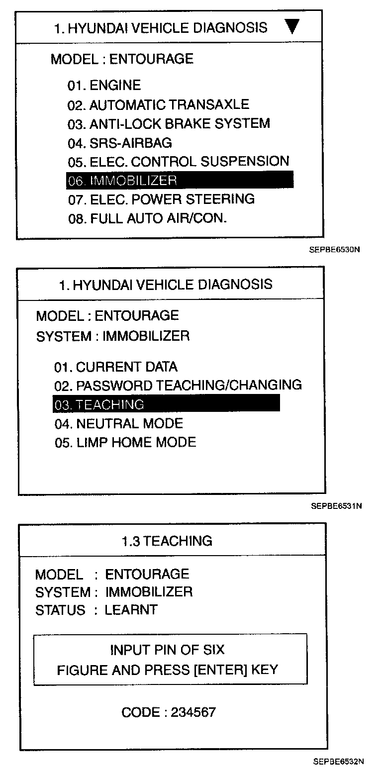 The procedure starts with an PCM (ECM) request for vehicle specific data (PIN code: 6 digits) from the tester. The "virgin" PCM (ECb1. stores the vehicle specific data and the key teaching can be started. The "learnt" PCM (ECM) compares the vehicle specific data from the tester with the stored data. If the data are correct, the teaching can proceed.