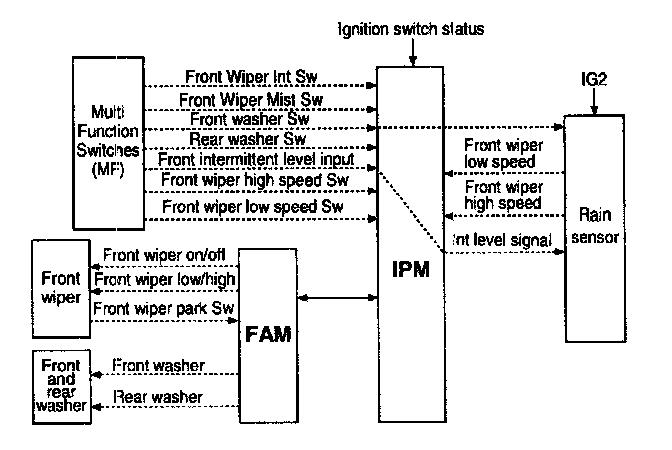 In the OFF and ACC states, the front wiper is not activated. If IGN2 turns OFF during wiper operation, the wiper stops at the current position and will move to the park position on the next IGN2 ON. In these states, the front washer is not active.