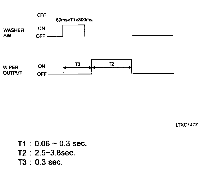 - If the washer signal is active for T1 (between 60 ms and 300 ms), the rear wiper output is turned on for T2 (2.5 - 3.8 sec.), T3 (300 ms) after the washer has been turned ON.