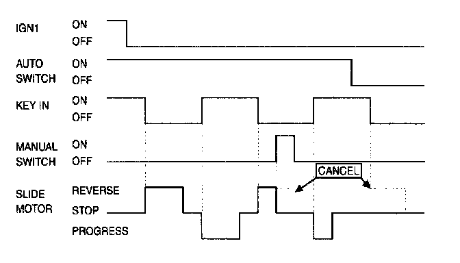 1. When IG is off (CAN BUS data IG transmitted from IPM is "off") and a key is removed (CAN BUS data Key Reminder Switch transmitted from IPM is "off"), and if "ID1" or "ID2" is received during keyless unlock operation, it automatically adjusts seat and pedal positions as memorized in keyless code (there is no buzzer out- put during preset recall operation by keyless). How ever, seat slide adjustment position is determined as follows, depending on Auto switch.