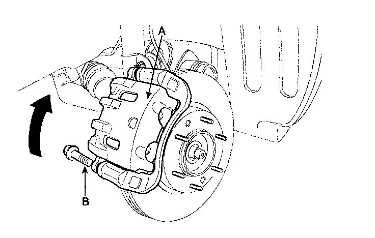 2. Remove the guide rod bolt (B), After raise the caliper assembly (A), support it with a wire.