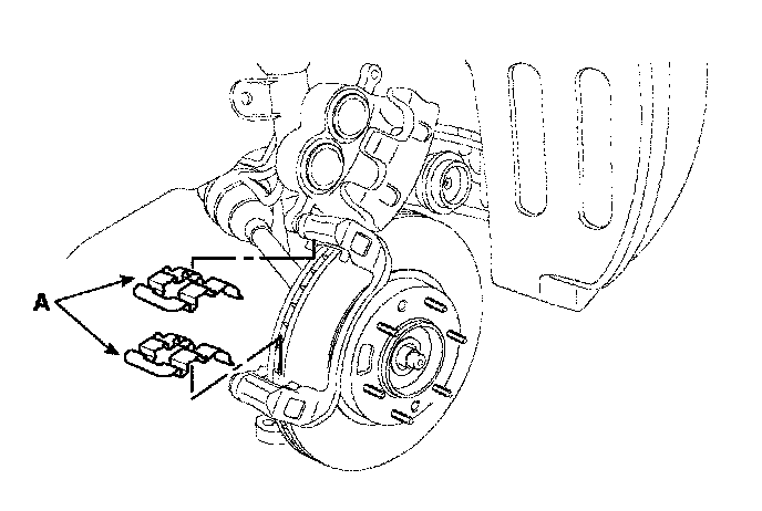 4. Push in the piston (A) so that the caliper will fit over the pads. Make sure that the piston boot is in position to prevent damaging it when pivoting the caliper down.