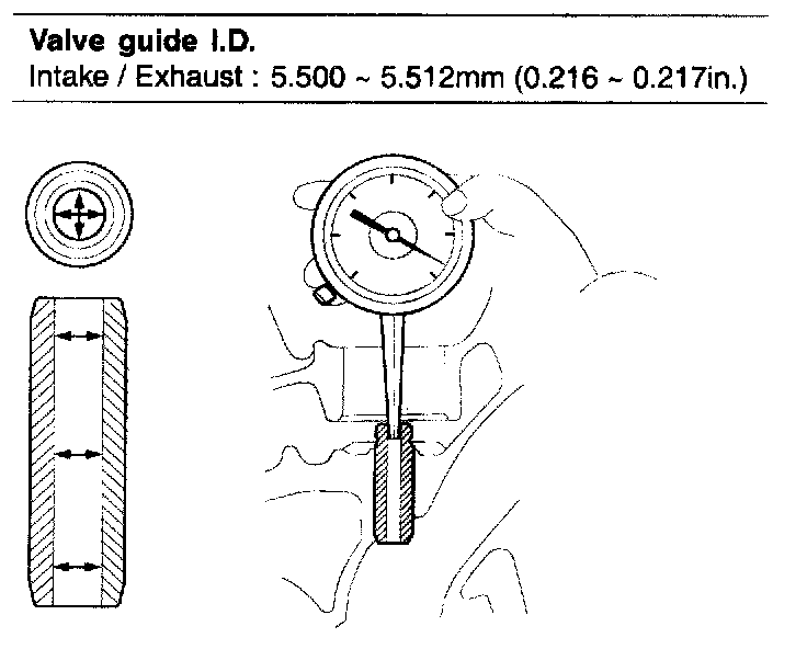 1) Using a caliper gauge, measure the inside diameter of the valve guide.