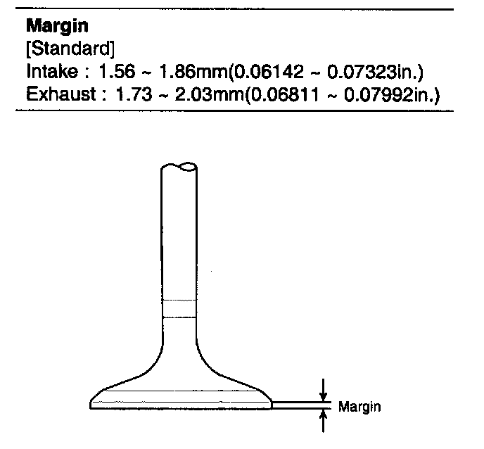 3) Check the valve head margin thickness. If the margin thickness is less than minimum, replace the valve.