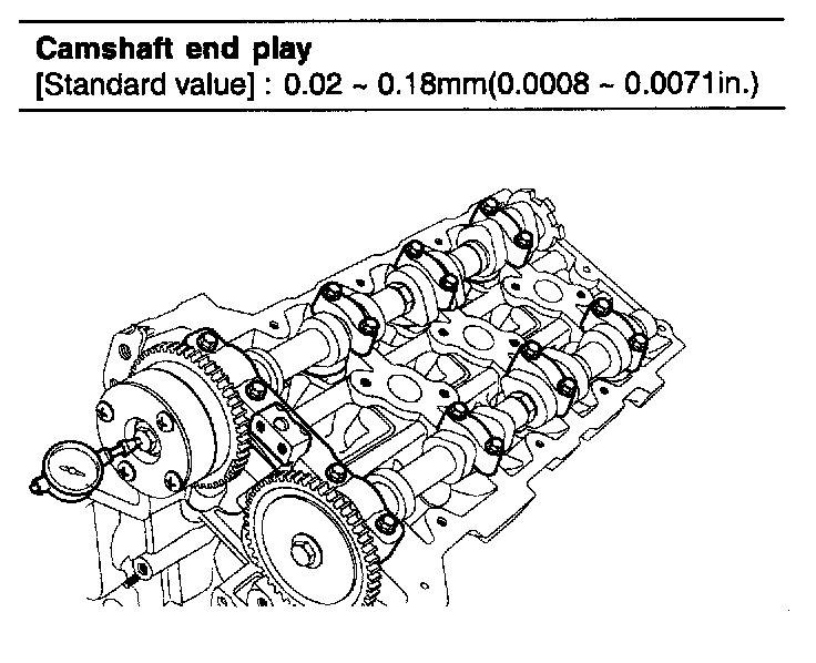 2) Using a dial indicator, measure the end play while moving the camshaft back and forth.