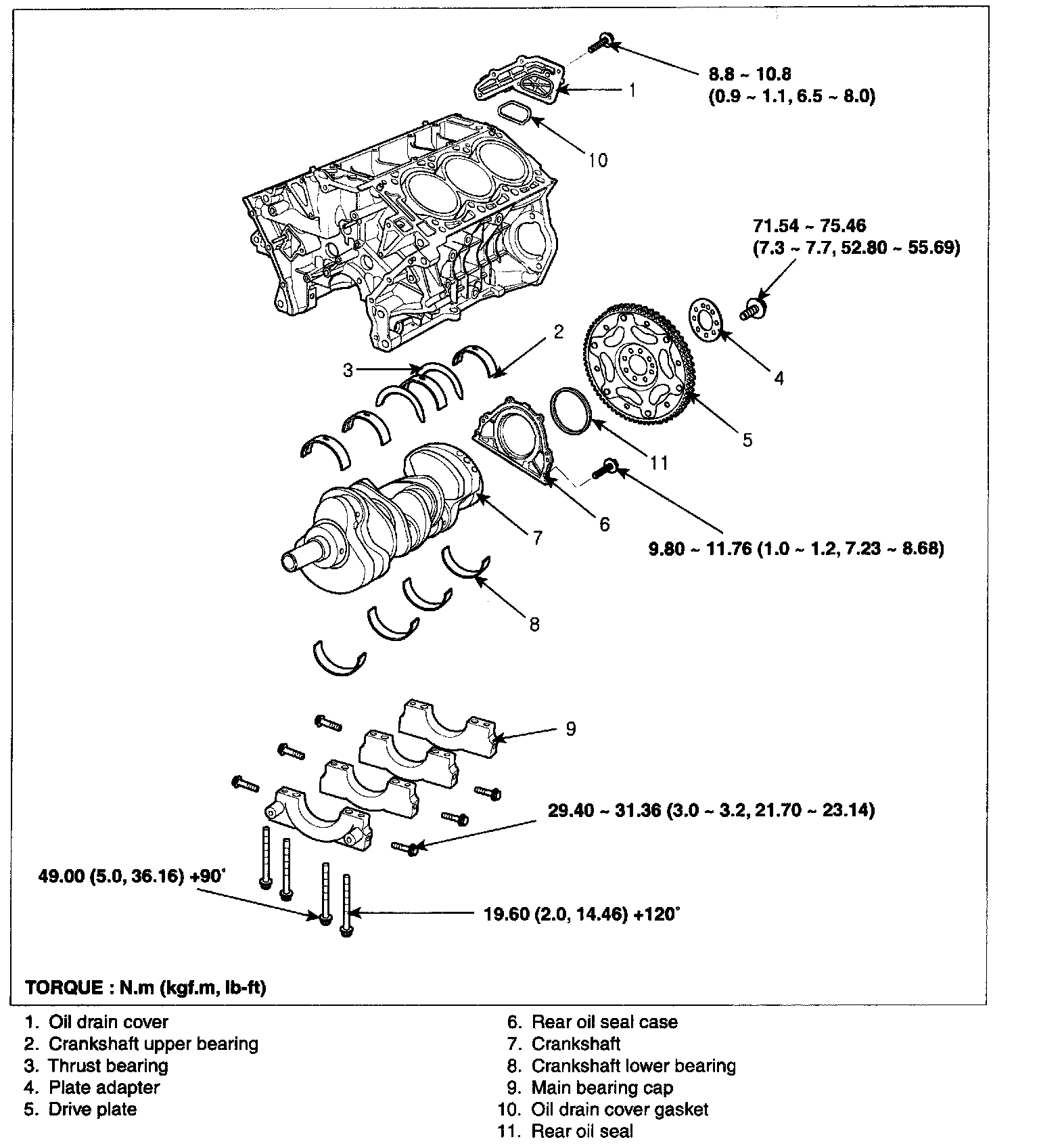 10. Remove crankshaft main bearing cap and check oil clearance.