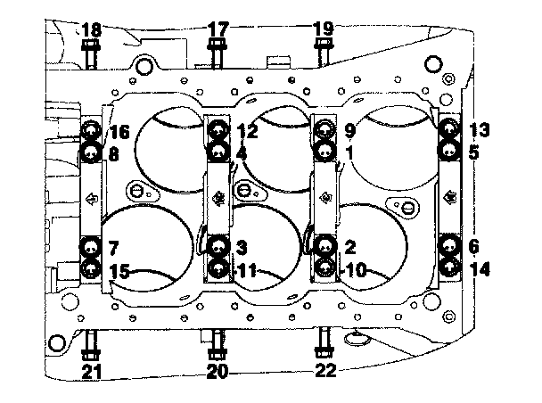 1) Install and uniformly tighten the bearing cap bolts, in several passes, in the sequence shown.