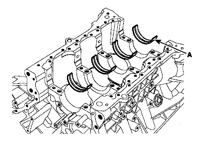Install the 2 thrust bearings(A) under the No.3 journal position of the cylinder block with the oil grooves facing outward.