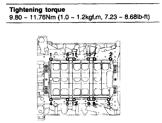 Main bearing cap bolt 49.00Nm(5.0 kgf.m, 36.16lb-ft) + 90° (1 - 8)