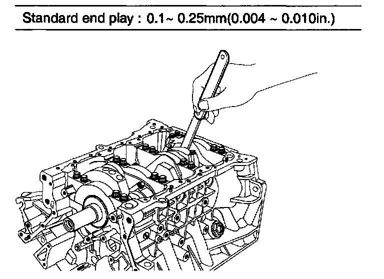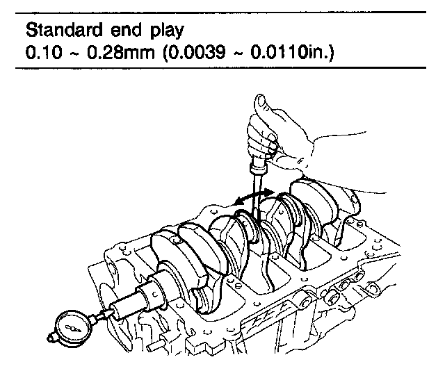 Using a dial indicator, measure the thrust clearance while prying the crankshaft back and forth with a screwdriver.