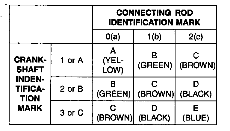 6) If the plastigage measures too wide or too narrow, remove the upper half of the bearing, install a new, complete bearing with the same color mark (select the color as shown in the next column), and recheck the clearance.