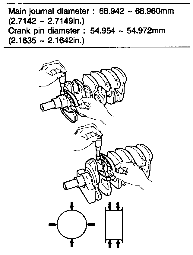 Using a micrometer, measure the diameter of each main journal and crank pin.